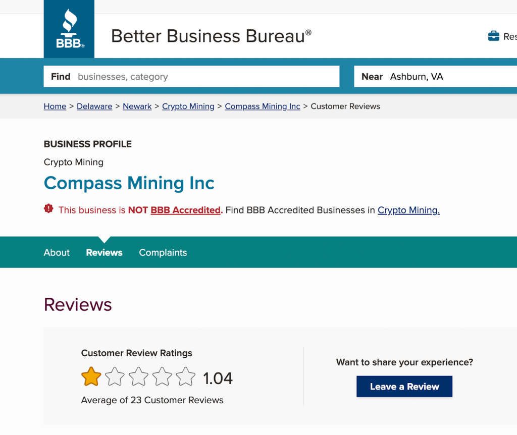 CompassMining has a 1.04 out of 5 rating on the Better Business Bureau