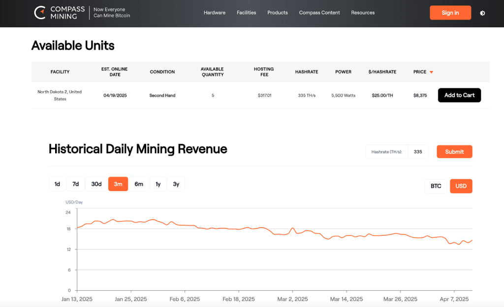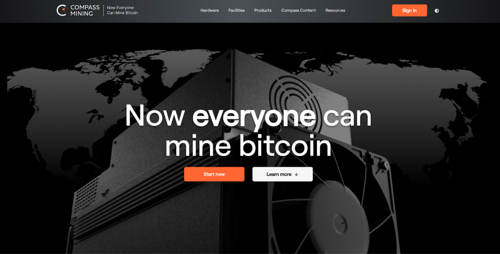 Compass’s pitch is simple: make mining as easy as buying a product online. You purchase a machine, choose a hosting facility, and start earning Bitcoin remotely. Their website acts as a mining marketplace, giving access to different facilities and equipment without the technical burden.